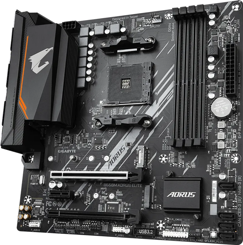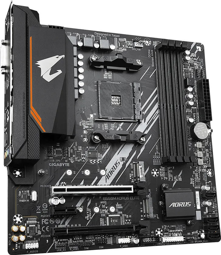 The Gigabyte BB550M AORUS ELITE AM4 Micro-ATX Motherboard is designed around the AMD B550 chipset, supporting 3rd Gen AMD Ryzen processors with an AM4 socket. It has four memory slots, supporting up to 128GB of dual-channel RAM, which can run at up to 4733 MHz (O.C.). This motherboard features a micro-ATX form factor, which fits in smaller cases. Other integrated features include Realtek Gigabit Ethernet, Realtek 7.1-channel audio support, RGB Fusion 2.0 support, and Gigabyte Q-Flash Plus.