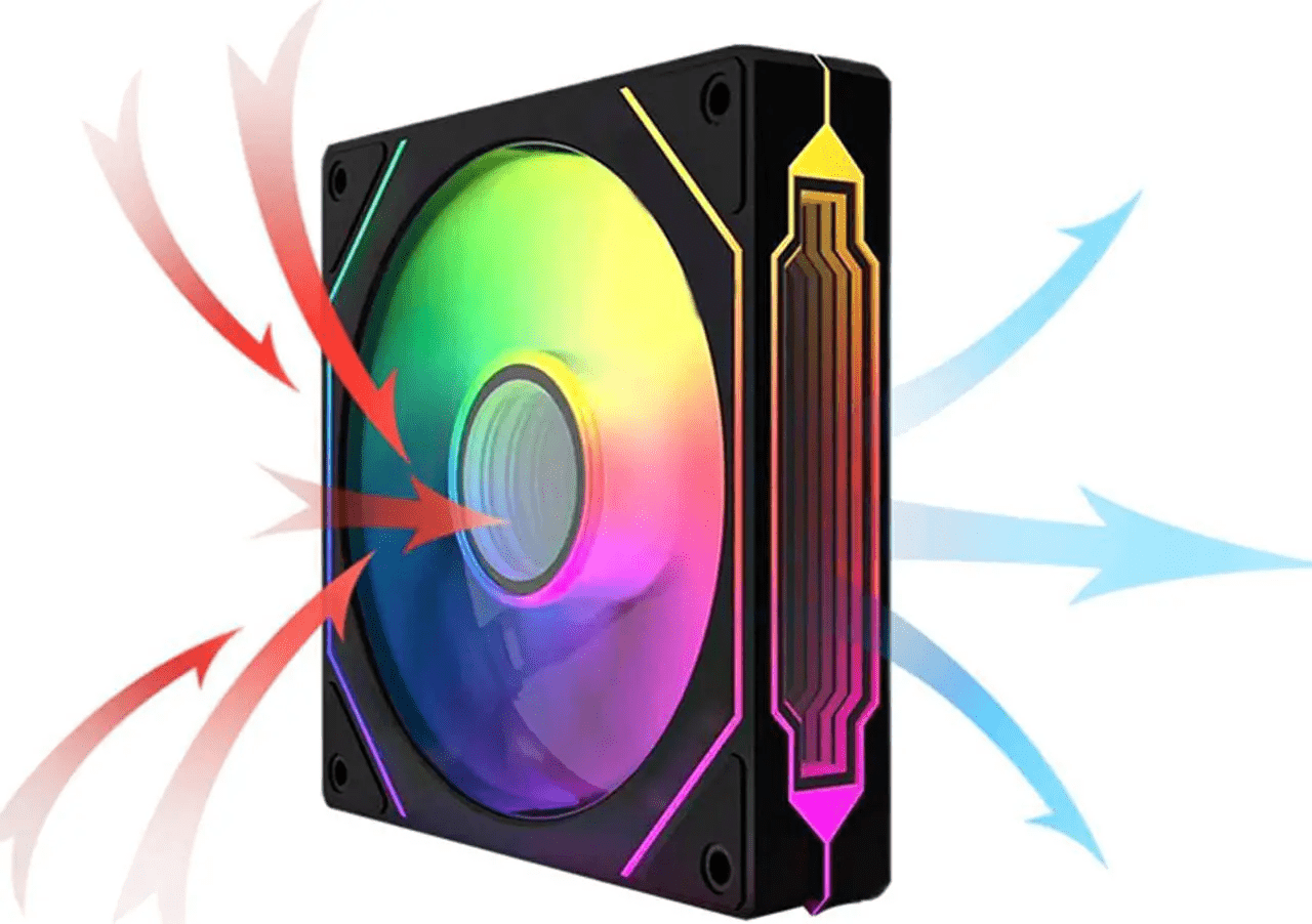• Three sided Infinite Mirror ARGB light effect The side infinity mirrors on the left and right sides of the fan are based on infinite geometry Multiple layers 0.5mm apart are visible in the circular infinity mirror at the center of the fan